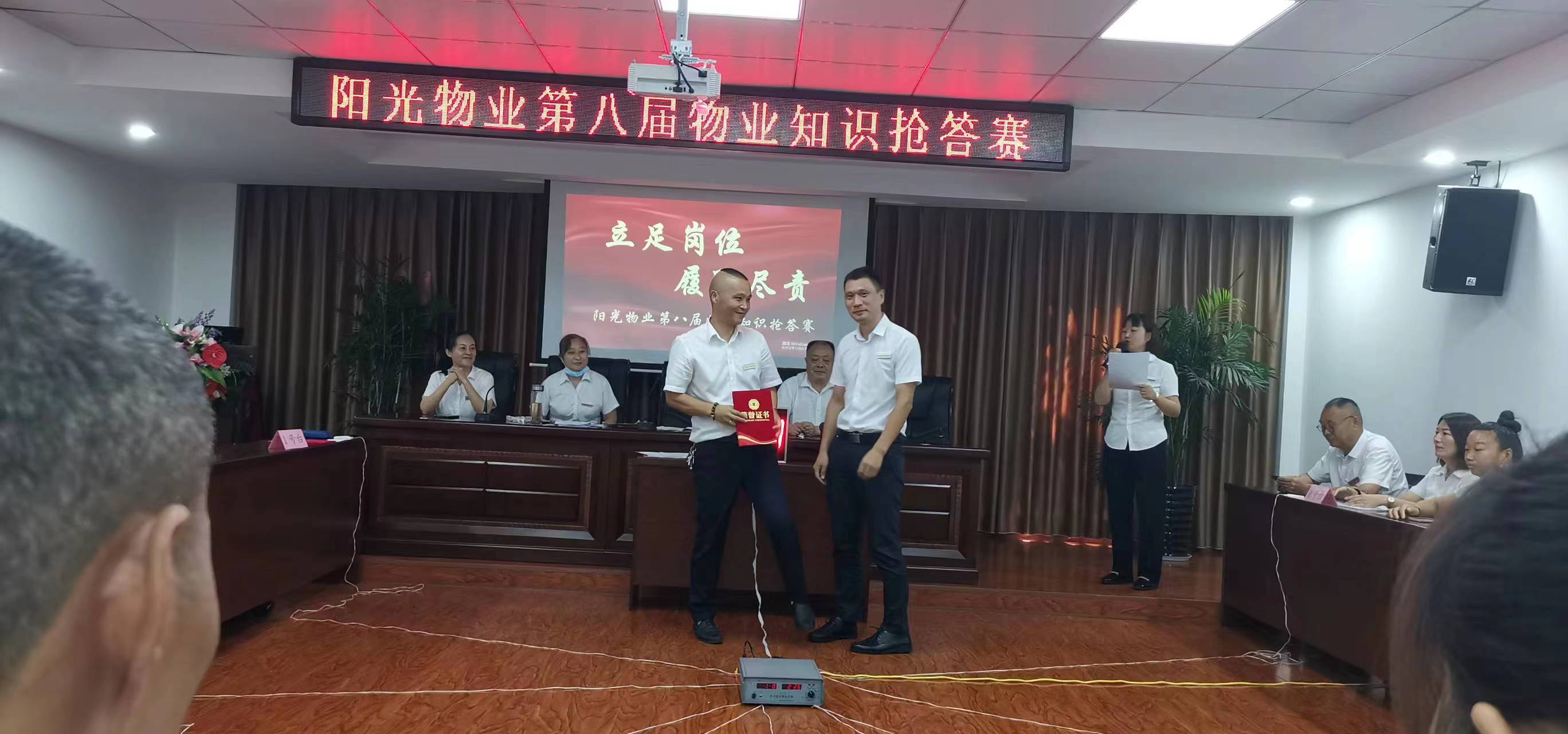 在大家共同的協(xié)調(diào)和配合下,陽(yáng)光物業(yè)第八屆物業(yè)管理知識(shí)搶答賽取得圓滿成功?;顒?dòng)現(xiàn)場(chǎng)掌聲雷鳴,充滿了歡快熱鬧的氣氛,各參賽隊(duì)積極參與,主持人風(fēng)趣幽默,現(xiàn)場(chǎng)井然有序,笑聲不斷。比賽由必答題、搶答題、風(fēng)險(xiǎn)題、觀眾答題四個(gè)環(huán)節(jié)組成。經(jīng)過一番激烈的競(jìng)爭(zhēng),最終由仙源保障房、廉租房組合的完美隊(duì)取得第一名,由廣德花苑、陽(yáng)光鑫都組合的輝煌隊(duì)獲得第二名,總部和公園壹號(hào)組合的葵花隊(duì)取得了第三名,陳勇同志以答對(duì)9題的優(yōu)異成績(jī)脫穎而出獲得優(yōu)秀答辯手獎(jiǎng)項(xiàng)。